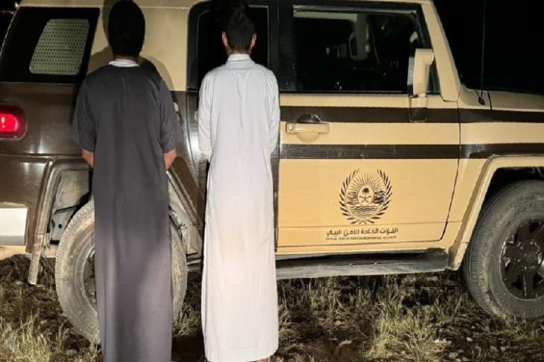 تمكنت الدوريات الميدانية للقوات الخاصة للأمن البيئي وهي تؤدي مهامها في تنفيذ نظام البيئة بمنطقة المدينة المنورة من القبض على مواطنين وهما: راكان حمدان الوافي، وأحمد حامد الوافي، لارتكابهما مخالفة الصيد دون ترخيص, بحوزتهما بندقية نارية، و(6) ذخائر ناريّة حيّة، وجرى ايقافهما اتخاذ الإجراءات النظامية بحقهما، وإحالتهما إلى الجهة المختصة.