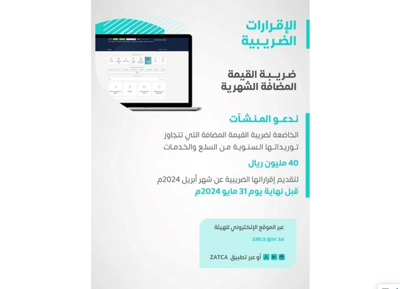 وحثت الهيئة المنشآت على المسارعة إلى تقديم إقراراتها الضريبية عبر الموقع الإلكتروني (zatca.gov.sa) أو تقديمها والسداد عبر تطبيق الهيئة للهواتف الذكية (ZATCA) وذلك تجنبًا لغرامة التأخر عن تقديم الإقرار في مدته المحددة بواقع 5% كحد أدنى و25% كحد أقصى من قيمة الضريبة التي كان يتعين على المكلف الإقرار بها.