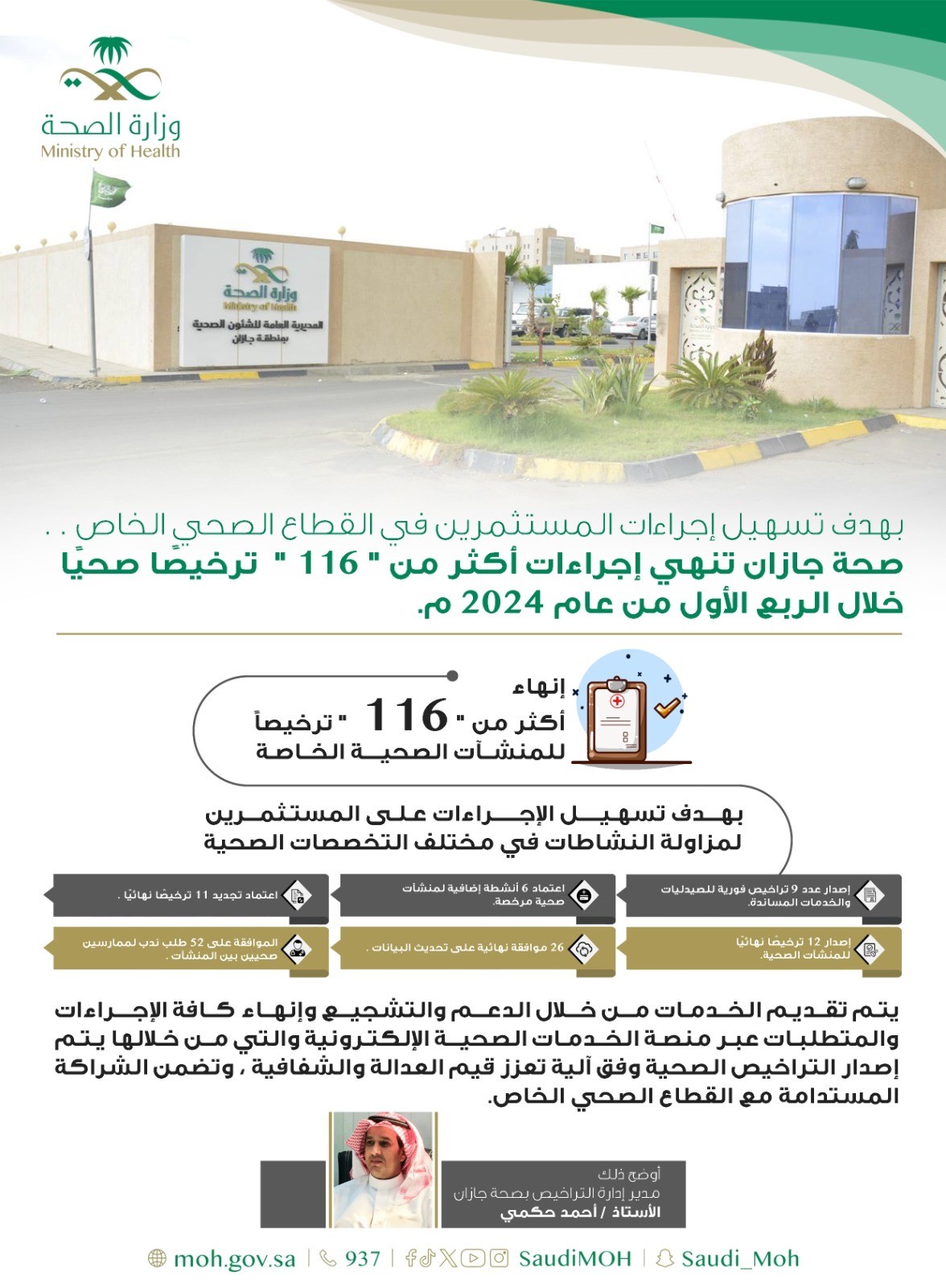 واوضح مدير إدارة التراخيص بصحة جازان أ. أحمد حكمي بأن التراخيص التي تم إصدارها خلال الربع الأول من هذا العام 2024 م ، شملت " 9 " تراخيص فورية للصيدليات والخدمات المساندة ، و " 12 " ترخيصًا نهائيًا للمنشآت الصحية ، بالإضافة إلى اعتماد " 6 " أنشطة إضافية لمنشآت صحية مرخصة ، واعتماد " 26 " موافقة نهائية لتحديث البيانات ، واعتماد تجديد " 11 " رخصة نهائية، والموافقة على " 52 “ طلب ندب للممارسين الصحيين بين المنشآت الصحية الخاصة •