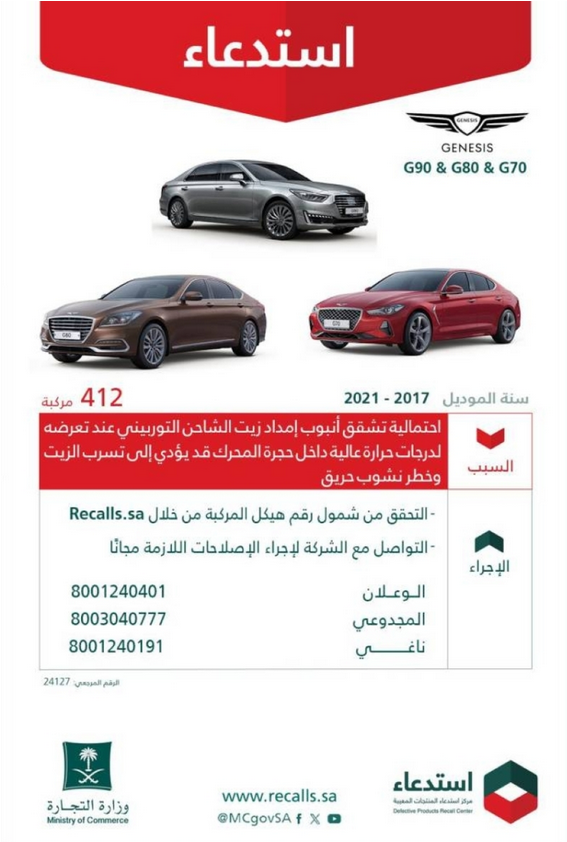 أعلنت وزارة التجارة عن استدعاء 412 مركبة من طراز جينيسيس (G90، G80، G70) موديلات 2017 - 2021، وذلك لاحتمالية تشقق أنبوب إمداد زيت الشاحن التوربيني نتيجة تعرضه لدرجات حرارة عالية داخل حجرة المحرك.