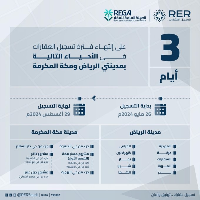 ودعت الهيئة ملاك العقارات الواقعة ضمن نطاق الأحياء المذكورة إلى سرعة المبادرة بتسجيل عقاراتهم من خلال منصة السجل العقاري rer.sa ، قبل انتهاء مدة التسجيل للاستفادة من خدمات تنفيذ التصرفات العقارية وتوثيق جميع التغييرات التي تطرأ على العقار.