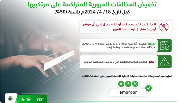 أكدت الإدارة العامة للمرور السعودي أن تخفيض المخالفات المرورية المتراكمة على مرتكبيها قبل تاريخ 18/ 4/ 2024م بنسبة (50%)، لا يتطلب التقديم أو التسجيل في أي مواقع أو زيارة مقارّ الإدارة العامة للمرور.