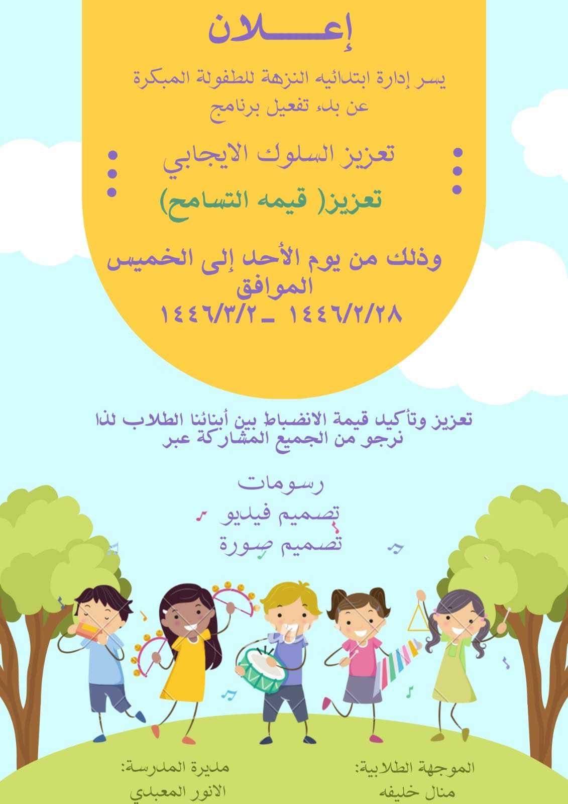 ابتدائية النزهة للطفولة المبكرة تنفذ برنامج تعزيز السلوك الإيجابي "قيمة التسامح"