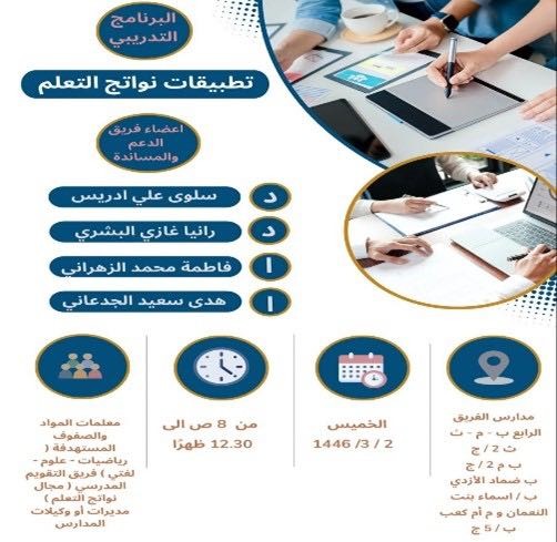 انطلاقاً من تطوير العملية التعليمية ، وتعزيز الاهتمام المؤسسي للرفع من مؤشر نواتج التعلم،  ورفع مهارات التفكير العليا،  وتوضيح دور الموجه الطلابي في التقويم المدرسي الدليل الإرشادي والخطة الإجرائية ، نفذ فريق الدعم والمساندة الرابع بمكتب تعليم بحرة بالإدارة العامة للتعليم بمنطقة مكة المكرمة، البرنامج التدريبي تحت عنوان (تطبيقات نواتج التعلم) يوم الخميس الموافق 2-3-1446هـ، بمقر الابتدائية والمتوسطة الثانية ببحرة المجاهدين تحت إشراف مديرة المدرسة إيمان اللهيبي وحضور معلمات المواد المستهدفة (لغتي-علوم-رياضيات) ؛ وذلك بهدف رفع كفاءة المعلمات المهنية والمعرفية في توظيف خطط التحسين والتطوير ومهارات التفكير والأنشطة الصفية واللاصفية في الرفع من مؤشر نواتج التعلم،