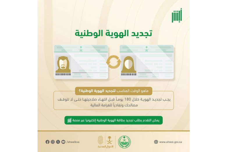 وقالت عبر “إكس”، إنه يجب تجديد الهوية خلال 180 يوما قبل انتهاء صلاحيتها حتى لا تتوقف مصالحك وتفاديا للغرامة المالية، مشيرة إلى أنه يمكن التقدم بطلب تجديد الهوية إلكترونيا عبر منصة “أبشر”