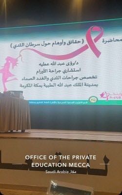 نفذت الإدارة العامة للتعليم بمنطقة مكة المكرمة ممثلة في إدارة تنمية القدرات قسم الشؤون الصحية المدرسية بتعليم مكة المكرمة بالتعاون مع مدينة الملك عبد الله الطبية والإدارة التنفيذية للصحة السكانية بالتجمع الصحي بمكة المكرمة اليوم الاثنين الموافق 4/4/1446هـ، الحملة التوعوية بسرطان الثدي تحت شعار (رايتك –وردية)، بقاعة الملك فهد – رحمه الله- ، لمنسوبات إدارة التعليم ومكاتب التعليم والمدارس، بهدف التوعية بأهمية الكشف المبكر عن سرطان الثدي تزامناً مع شهر أكتوبر العالمي للتوعية بسرطان الثدي، ورفع مستوى الوعي العام بمرض سرطان الثدي وأهمية الكشف المبكر عنه وأكثر الفئات عرضة للإصابة به.