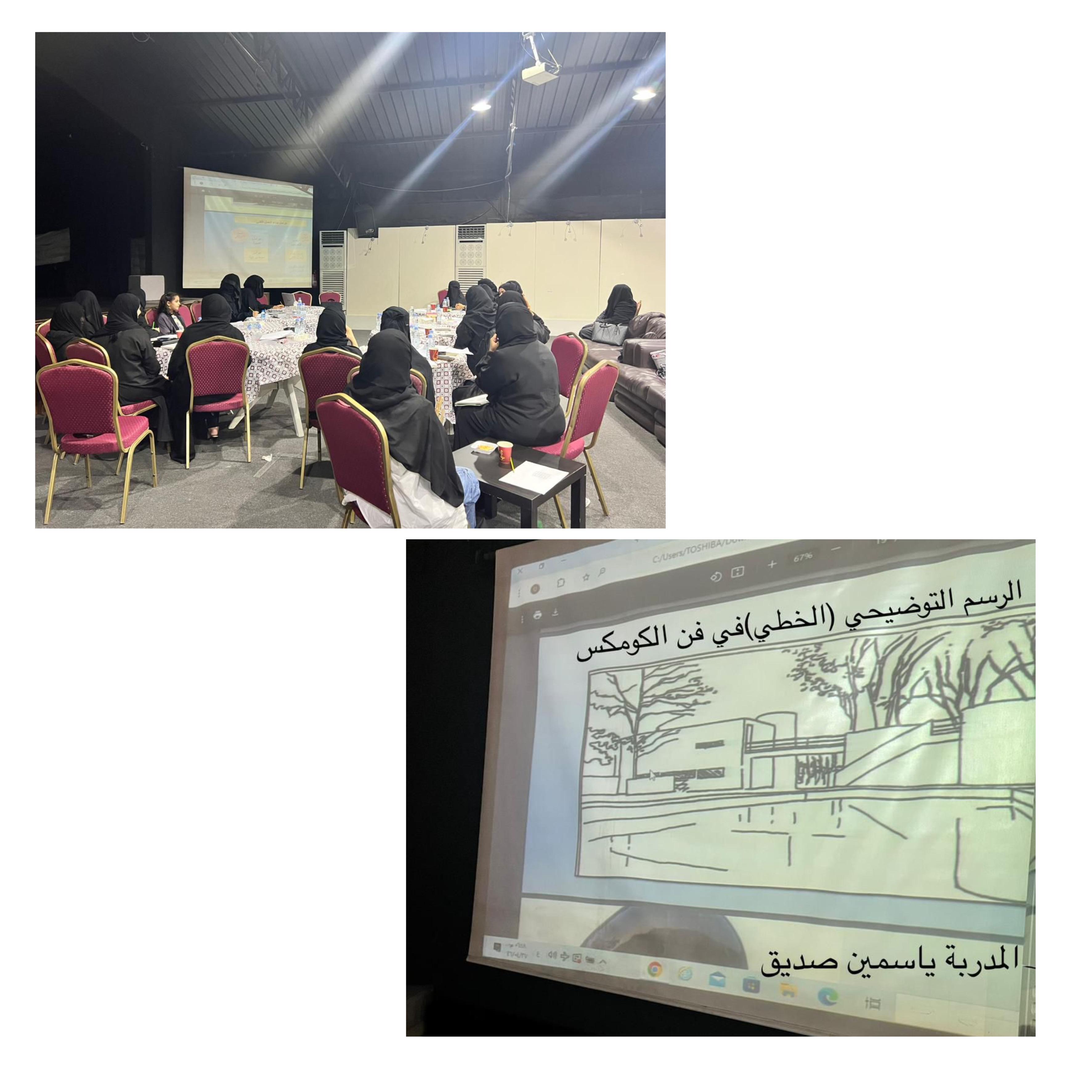 وأكدت المدربة على أهمية كل عنصر من عناصر التصميم (النقطة ، الخط والشكل والحجم والملمس والضوء والظل واللون) في بناء العمل الفني إذا ماوظفت بطريقة سليمة تعكس مهارة الفنان وإبداعاته الفنية، كما تناولت المدربة الأسس الواجب مراعاتها في بناء العمل الفني ، هذا وقد لاقت الورشة الكثير من التفاعل والمشاركة من قبل المتدربات ،حيث أكدت المدربة ياسمين صديق على ضرورة مراعاة أسس التكوين ، وعناصر التصميم عند تطبيق فن الكومس للوصول إلى مخرجات متميزة وأعمال فنية ذات جودة تنهض بمستوى الفن والفنانات بمدينة الطائف.
