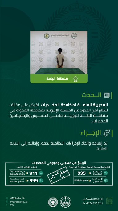قبضت المديرية العامة لمكافحة المخدرات على مخالف لنظام أمن الحدود من الجنسية الإثيوبية بمحافظة المخواة في منطقة الباحة، لترويجه مادتي الحشيش والإمفيتامين المخدرتين، وجرى إيقافه، واتخاذ الإجراءات النظامية بحقه، وإحالته إلى النيابة العامة.