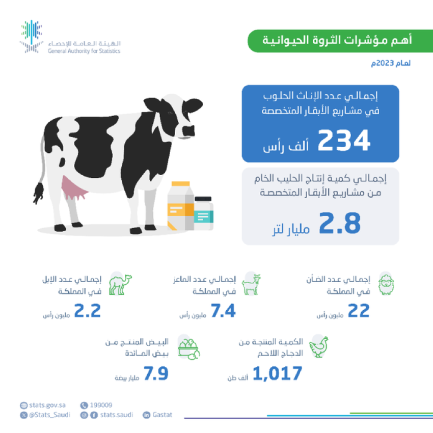 يُذكر أن نشرة إحصاءات الثروة الحيوانية تستند إلى بيانات المسح الزراعي الشامل الذي أجرته الهيئة العامة للإحصاء على مستوى المناطق الإدارية بالمملكة العربية السعودية، والبيانات السجلية من وزارة البيئة والمياه والزراعة، وصندوق التنمية الزراعية، وهيئة الزكاة والضريبة والجمارك، والبنك المركزي السعودي، وتوفر بيانات حديثة عن أعداد الثروة الحيوانية، والطيور والدواجن، وأعداد الثروة الحيوانية العضوية، وكمية وقيمة الصادرات والواردات من المنتجات الحيوانية، وقيمة القروض الممنوحة لمشاريع الثروة الحيوانية على مستوى المناطق الإدارية بالمملكة.