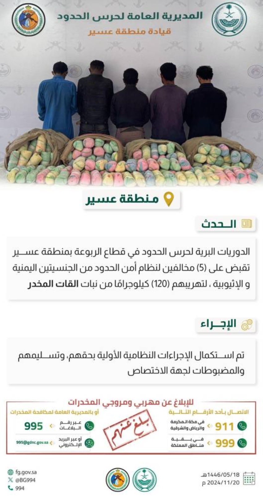 قبضت الدوريات البرية لحرس الحدود في قطاع الربوعة بمنطقة عسير على (5) مخالفين لنظام أمن الحدود من الجنسيتين اليمنية والإثيوبية، لتهريبهم (120) كلجم من نبات القات، وجرى استكمال الإجراءات النظامية الأولية بحقهم، وتسليمهم والمضبوطات لجهة الاختصاص.