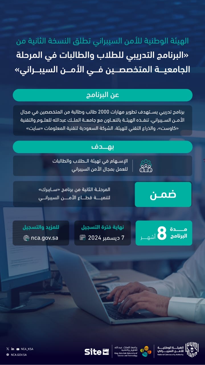 وأوضحت الهيئة أن البرنامج يأتي ضمن المرحلة الثانية من برنامج «سايبرك» لتنمية قطاع الأمن السيبراني، ويستهدف تدريب أكثر من 2000 من الطلاب والطالبات في المرحلة الجامعية من كافة تخصصات الأمن السيبراني والتخصصات ذات العلاقة في مختلف الجامعات داخل المملكة، بالتعاون مع جامعة الملك عبدالله للعلوم والتقنية «كاوست»، والذراع التقني للهيئة، الشركة السعودية لتقنية المعلومات «سايت».