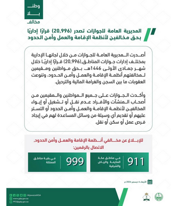 أصدرت المديرية العامة للجوازات من خلال لجانها الإدارية بمختلف إدارات جوازات المناطق, (20,996) قرارًا إداريًا خلال شهر جمادى الأولى 1446هـ، بحق مواطنين ومقيمين لمخالفتهم أنظمة الإقامة والعمل وأمن الحدود، وتنوعت العقوبات ما بين السجن والغرامة المالية والترحيل.