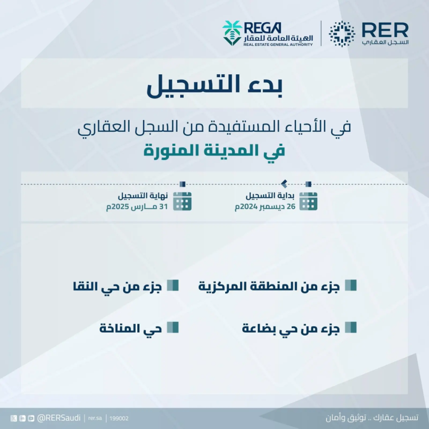 ويشمل التسجيل الأحياء التالية: (جزء من المنطقة المركزية، وجزء من حي بضاعة، وجزء من حي النقا، وحي المناخة)، ويجب على ملاك العقارات الواقعة في نطاق الأحياء تسجيل عقارتهم قبل نهاية يوم 31 مارس 2025م الموافق 2 شوال 1446هـ، ويمكن التحقق من موقع العقار إذا كان ضمن المناطق المعلنة من خلال منصة السجل العقاري.
