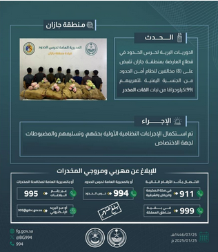 حرس الحدود بجازان يقبض على (8) مخالفين لتهريبهم (99) كيلوجرامًا من القات المخدر