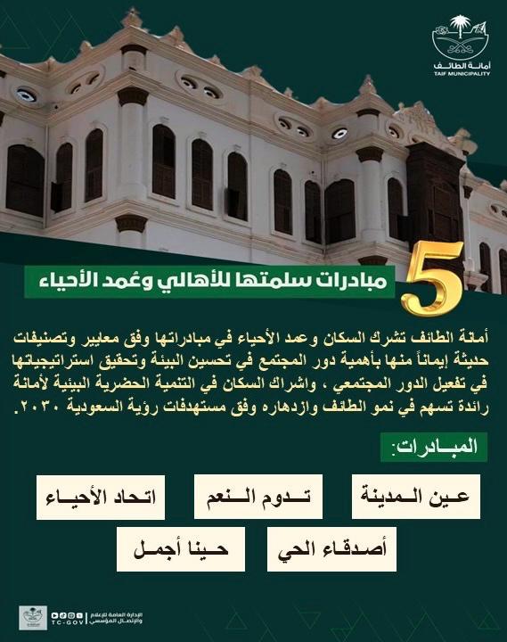 أطلقت أمانة الطائف ممثلة في الإدارة العامة للإعلام والاتصال المؤسسي 5 مبادرات مجتمعية تطوعية جديدة، انطلاقاً من أهمية دور المجتمع في التخطيط والتنمية الحضرية، أشركت فيها امانة الطائف السكان وعمد الأحياء في مبادراتها لتحسين المشهد الحضري وتعزيز الدور الرقابي، وذلك وفق معايير وتصنيفات حديثة، بما يعزز تحقيق استراتيجيتها في تفعيل الدور المجتمعي، وإشراك السكان في التنمية الحضرية البيئية لأمانة رائدة تسهم في نمو الطائف وازدهارها وفق مستهدفات رؤية السعودية 2030، ويأتي إشراك عمد الأحياء في هذه المبادرات لتعزيز دورهم التكاملي مع الأمانة، ولدعم الجهود التنموية والتطويرية والتوعوية في الأحياء، والعمل على إيجاد حلقة ربط بين الأمانة ومتلقي الخدمة في الأحياء، ومن خلال العمد.