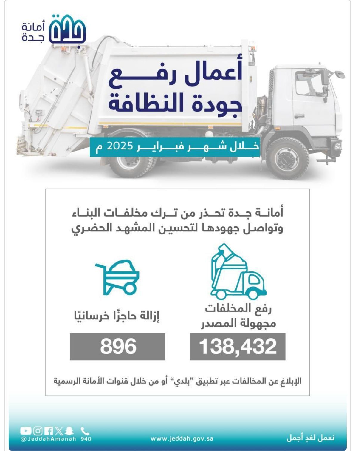 "أمانة جدة" ترفع أكثر من 138 ألف متر مكعب من المخلفات خلال شهر فبراير