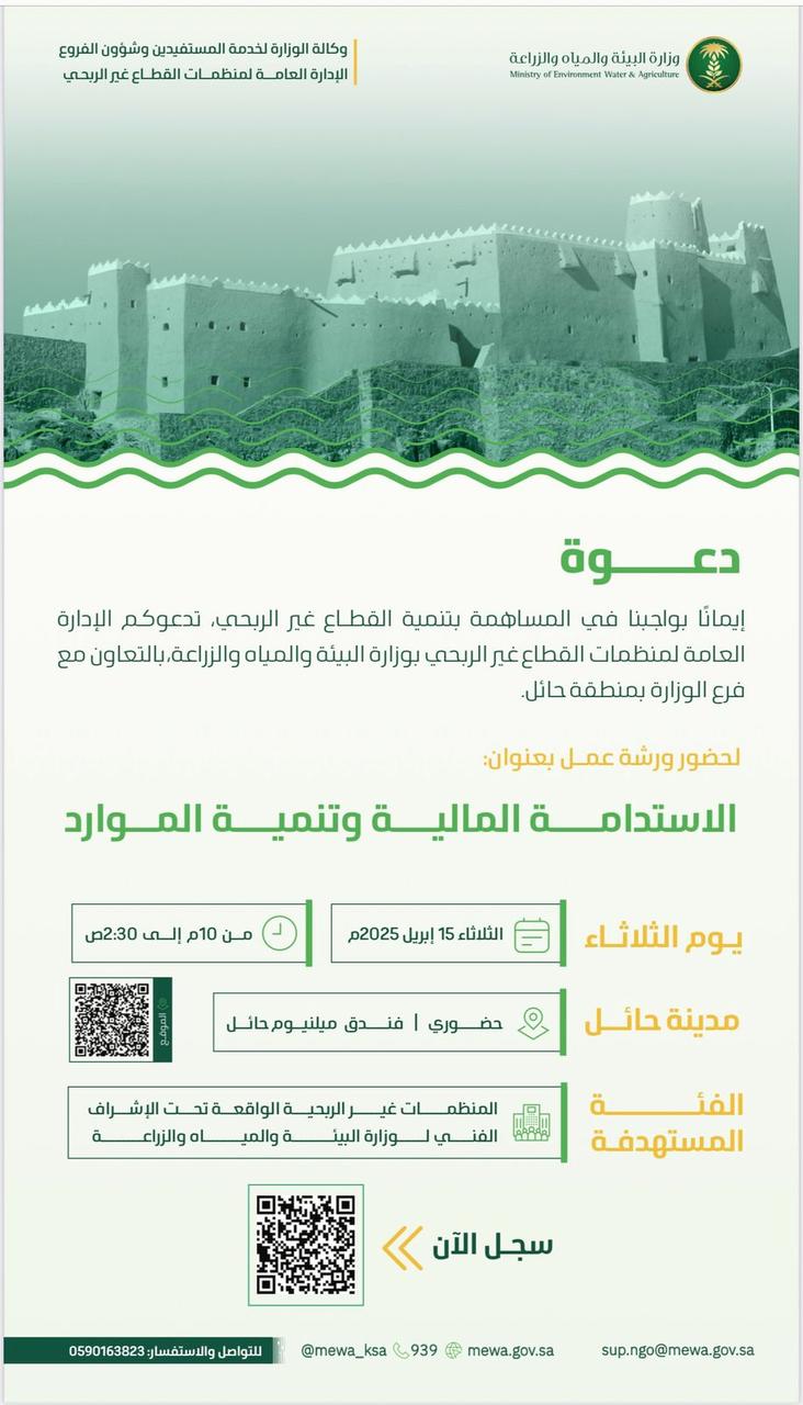 في إطار جهودها المستمرة لدعم وتمكين منظمات القطاع غير الربحي، تنظم وزارة البيئة والمياه والزراعة "ممثلة بالإدارة العامة لمنظمات القطاع غير الربحي"، وبالتعاون مع فرع الوزارة بمنطقة حائل ورشة عمل بعنوان “الاستدامة المالية وتنمية الموارد”، وذلك يوم الثلاثاء 15 إبريل 2025م، في فندق ميلينيوم بمدينة حائل، من الساعة 10 صباحاً حتى 2:30 ظهراً.