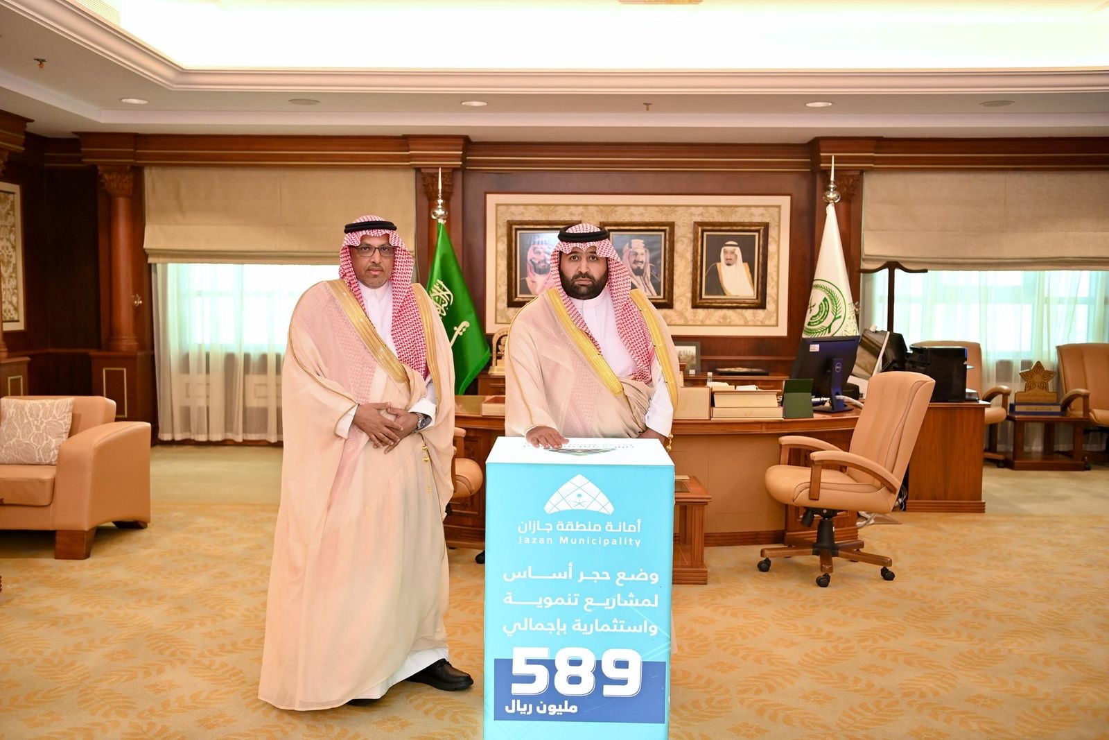 وضع صاحب السمو الملكي الأمير محمد بن عبدالعزيز بن محمد بن عبدالعزيز نائب أمير منطقة جازان، في مكتبه اليوم، حجر الأساس لـ 42 مشروعًا تنمويًا واستثماريًا بتكلفة إجمالية بلغت 589 مليون ريال.