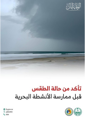 وأهابت المديرية العامة لحرس الحدود بالجميع أخذ الحيطة والحذر، والاتصال بالرقمين (911) في منطقتي مكة المكرمة والشرقية، و(994) في بقية مناطق المملكة لطلب المساعدة في الحالات الطارئة.