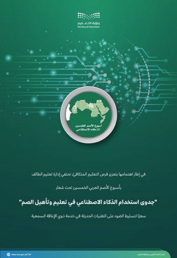 تشارك الإدارة العامة للتعليم في الطائف المجتمع الاحتفاء بأسبوع الأصم العربي50 "تحت شعار جدوى استخدام الذكاء الاصطناعي في تعليم وتأهيل الصم"، كما تشمل فعاليات الأسبوع على برامج ومسابقات رياضية بين الطلاب الصم وطلاب التعليم العام ، إضافة إلى التعريف بالأصم وقدراته وتعليمه وأساليب رعايته وإعداده للحياة الاجتماعية والمهنية وطرق التواصل بينه وبين أفراد المجتمع من خلال التعريف بالصمم وسبل الوقاية منه، وإبراز وسائل رعاية الصم وتعليمهم، وتوجيه الرأي العام للاهتمام بهم، وكذلك تعزيز كامل حقوقهم في المشاركة والإسهام في المجتمع، وذلك بالتعاون مع الهيئات العاملة مع الصم في العالم العربي، والتأكيد على أهمية إشراك الصم وأولياء أمورهم في هذه الفعالية.