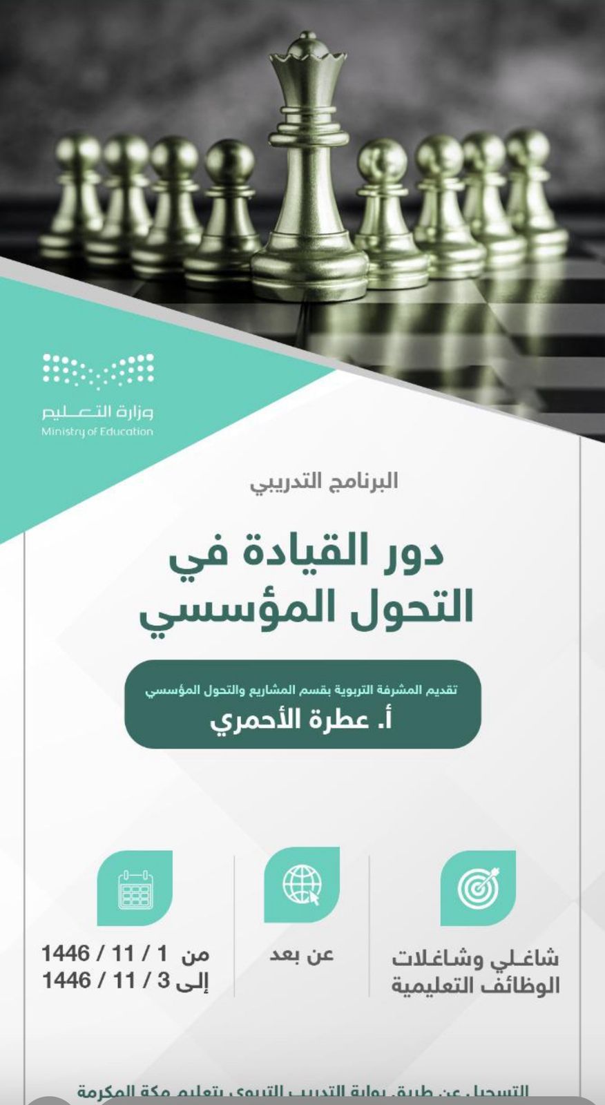 نفذت الإدارة العامة للتعليم بمنطقة مكة المكرمة ممثلةً في إدارة التطوير والتحول - قسم المشاريع والتحول المؤسسي - الدورة التدريبية " دور القيادة في التحول المؤسسي" ، نفذتها المشرفة التربوية عطرة الأحمري، وذلك من يوم الثلاثاء الموافق 1446/11/1هـ وعلى مدار ثلاثة أيام .