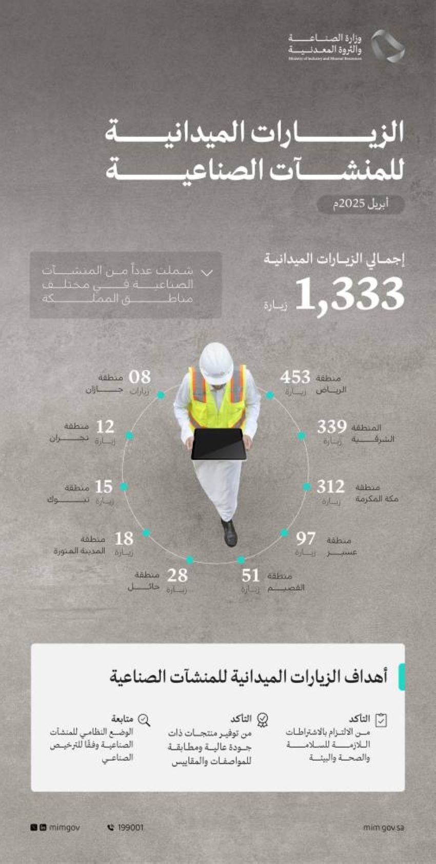 نفذت وزارة الصناعة والثروة المعدنية ممثلة في الإدارة العامة للفروع 1,333 زيارة ميدانية على المنشآت الصناعية في عددٍ من مناطق المملكة خلال شهر أبريل الماضي، وذلك في إطار جولات الوزارة الدورية لمتابعة المصانع، والوقوف على مدى جاهزيتها، والتأكد من التزامها بتطبيق معايير الجودة والاشتراطات اللازمة.