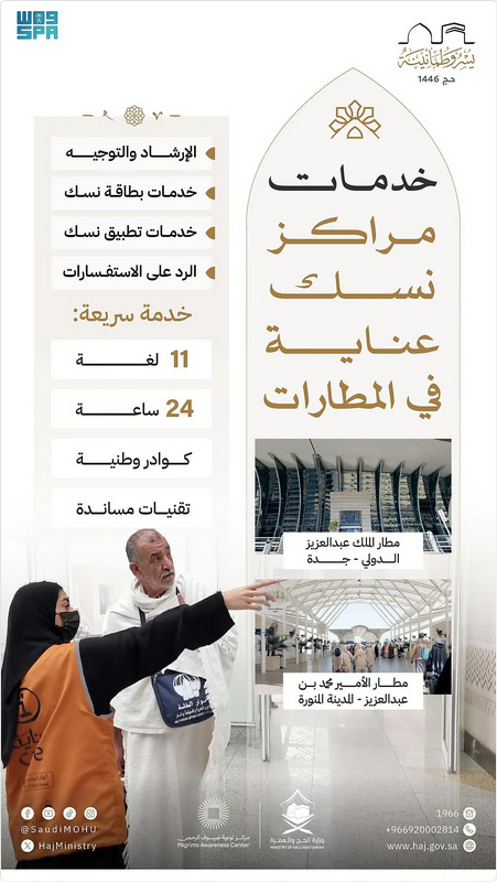 أعلنت وزارة الحج والعمرة عن توسّع كبير في انتشار مراكز "نُسك عناية" خلال موسم حج هذا العام 1446هـ، حيث تم تشغيل أكثر من 39 مركزًا ميدانيًا و142 نقطة خدمة إضافية في مواقع حيوية تشمل مكة المكرمة والمدينة المنورة وجدة والمشاعر المقدسة والمنافذ البرية والبحرية والجوية، وذلك استكمالاً لعمل 15 مركزًا دائمًا تعمل على مدار العام.