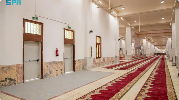 واستُكملت أعمال التطوير بتركيب نظام صوتيات متقدم وكاميرات مراقبة أمنية، ضمن منظومة متكاملة لتعزيز الأمن والسلامة داخل المسجد، إضافة إلى تنظيم البوابات والمداخل لضمان انسيابية الحركة، ويبلغ إجمالي عدد الأبواب (72) بابًا، وتولت تنفيذ هذه المهام فرق إشرافية وخدمية تباشر أعمالها لتقديم أرقى الخدمات لضيوف الرحمن.