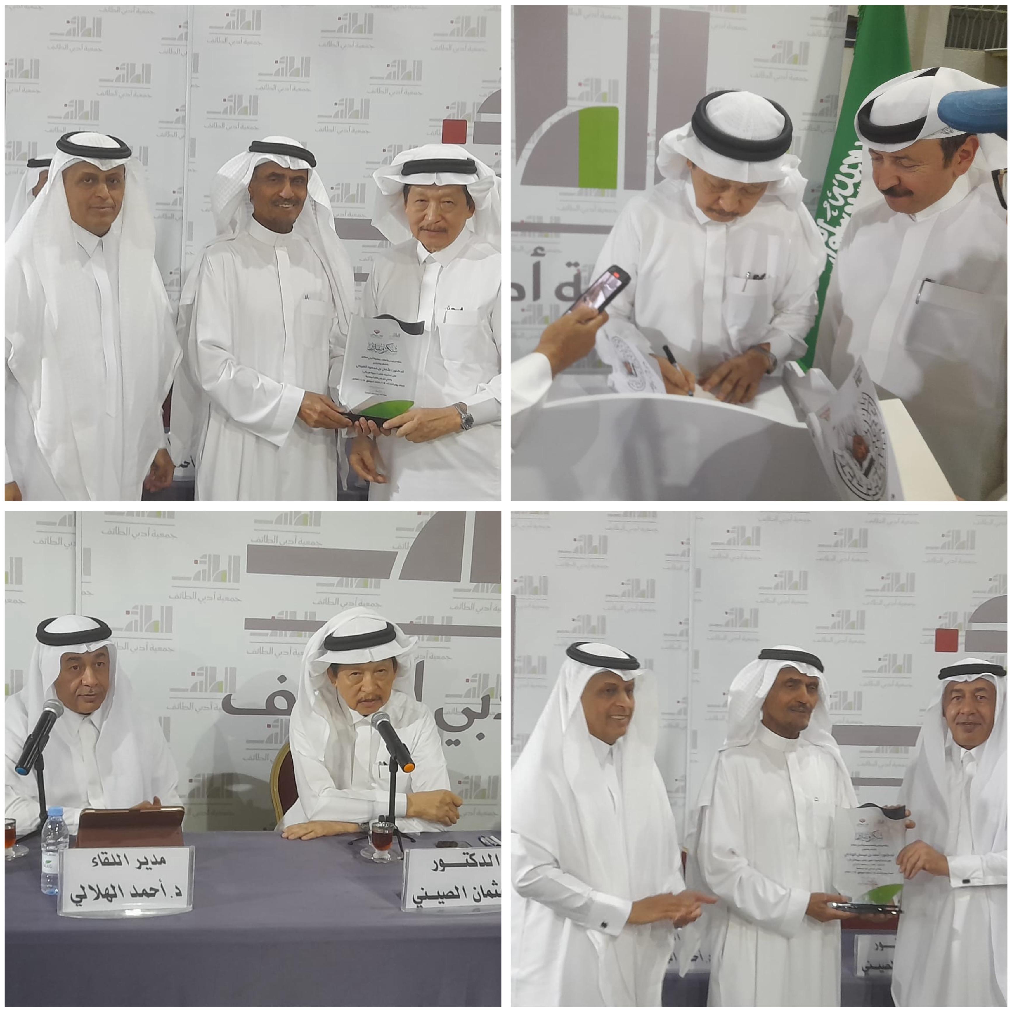 ثم تشارك رئيس الجمعية الأستاذ عطا الله الجعيد، وعضو مجلس الشورى الأستاذ سليمان الزايدي تكريم الضيف، ومدير الأمسية، لتختم الأمسية بتوقيع د. الصيني للكتاب.