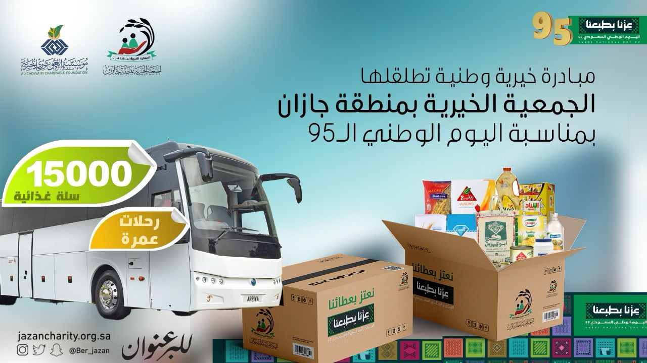 في لوحة وطنية تجسّد قيم العطاء والانتماء، وتفاصيل الفخر والاعتزاز بمناسبة اليوم الوطني الـ95 للمملكة، أطلقت الجمعية الخيرية بمنطقة جازان مبادرة إنسانية وطنية تحت شعار: "نعتز بعطائنا"، تمثلت في توزيع 15000 سلة غذائية متكاملة للأسر المحتاجة، وتنظيم رحلات عمرة مجانية لمن لم يسبق لهم أداء العمرة ، في بادرة إنسانية مفعمة بالرحمة والانتماء والولاء.