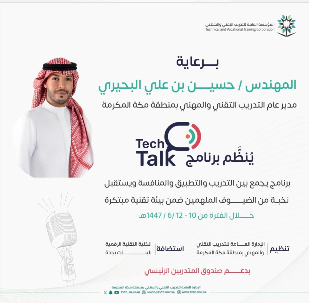 برعاية مدير عام الإدارة العامة للتدريب التقني والمهني بمنطقة مكة المكرمة المهندس حسين بن علي البحيري، وبدعم من صندوق المتدربين الرئيسي، انطلقت صباح اليوم فعاليات “تحدي Tech Talk” الذي تستضيفه الكلية التقنية الرقمية للبنات بجدة خلال الفترة من 1 إلى 3 ديسمبر 2025.
