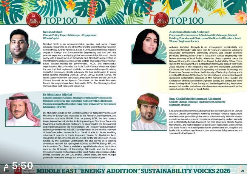 تم اختيار المهندسة الشيماء الشايب، بمناسبة اختيارها ضمن قائمة أفضل 100 صوت للاستدامة في الشرق الأوسط لعام 2026، وفق تقرير Energy Addition الصادر عن Gulf Intelligence.