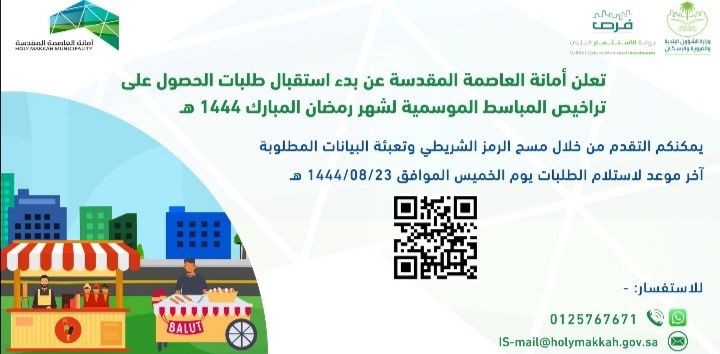 ويأتي ذلك بهدف رفع كفاءة جودة الخدمات المقدمة وفق معايير عالية، والتأكد من تقديم وتداول المواد الغذائية بطرق صحية آمنة ولتقديم أفضل الخدمات لأهالي وزوار مكة المكرمة،وأشارت الأمانة الى أنها بدأت فعليا في إستقبال طلبات الحصول على تراخيص المباسط الموسمية لشهر رمضان المبارك للعام 1444هـ ، لافتةً الى أن أخر موعد لإستلام الطلبات سيكون يوم الخميس الموافق 23 / 08 / 1444هـ.