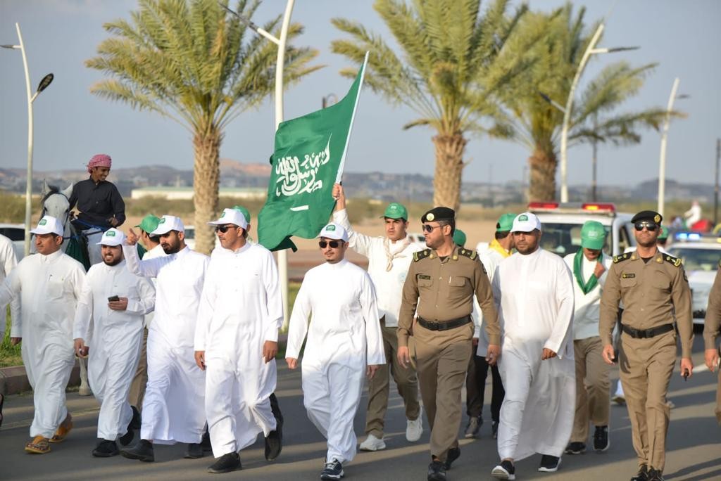 وتقدم بن رقوش المسيرة برفقة مدراء الدوائر الحكومية والامنية وجمع من الأهالي بمشاركة من ميدان فروسية الباحة واسطبل أصايل العز حيث اتجهت المسيرة إلى دوار العلم و شهدت تفاعلاً واسعاً من الأهالي تعبيراً عن فرحهم واعتزازهم بهذه المناسبة الغالية.