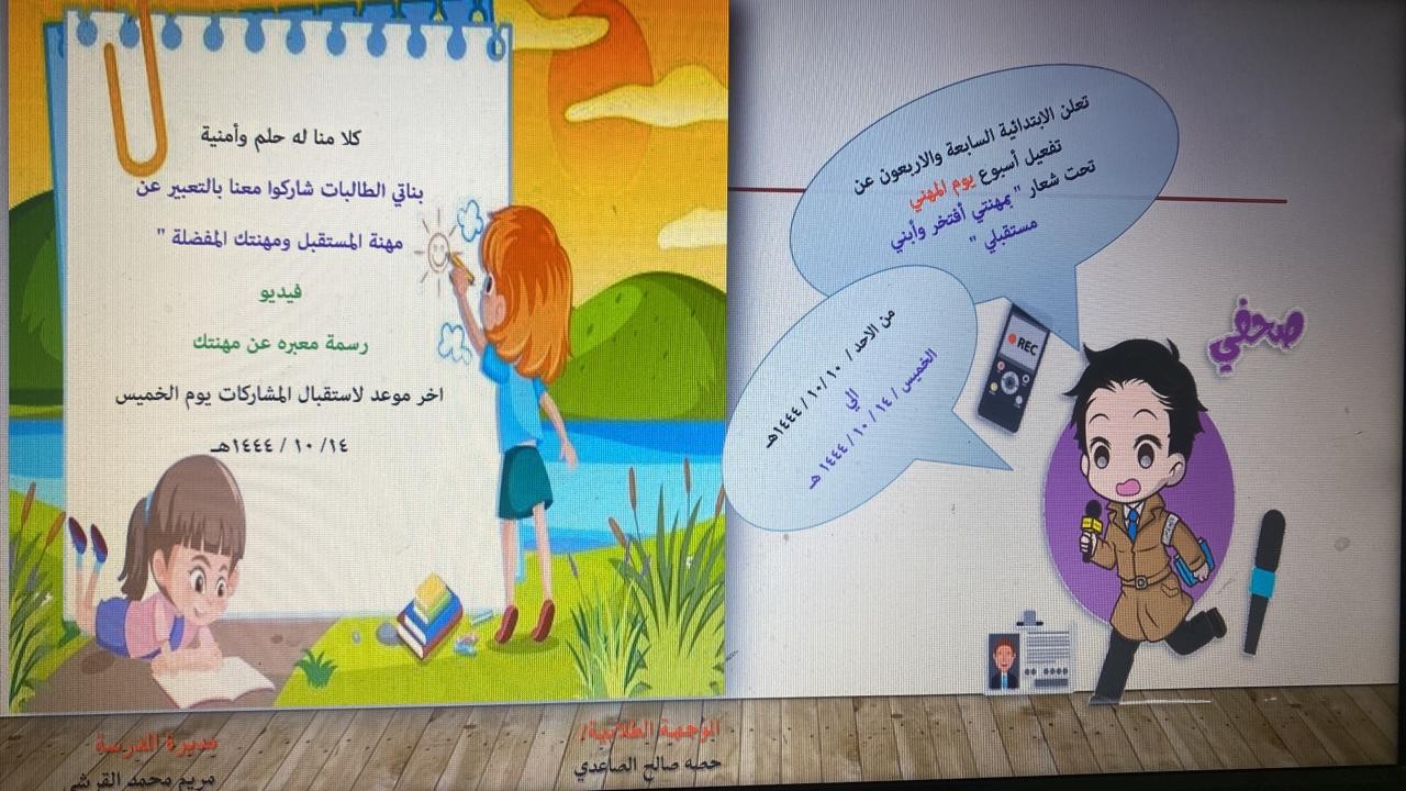 أقامت الابتدائية السابعة والأربعون التابعة تعليم شمال مكة بالإدارة العامة للتعليم بمنطقة مكة المكرمة ولمدة أسبوع ابتداءً من يوم الأحد الموافق 10/ 10 / 1444هـ، تفعيلاً ليوم المهنة بعنوان (بمهنتي أفتخر وأبني مستقبلي) من قبل الموجهة الطلابية حصة الصاعدي بإشراف مديرة المدرسة مريم القرشي.