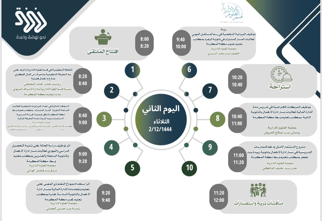 هذا واستهلت الجلسة الثانية لليوم التالي بورقة عمل بعنوان "الثقافة التنظيمية في قسم العلوم الإدارية وأثرها على بناء المعرفة التنظيمية وتنمية رأس المال الفكري نماذج أعمال فصلية" قدمتها رئيسة قسم العلوم الإدارية بإدارة الإشراف التربوي ربا المفلحي ، تلا ذلك ورقة عمل بعنوان "الإسعافات المالية في إعداد الميزانيات الشخصية لطالبات المرحلة الثانوية المسار المشترك بمكتب تعليم وسط مكة وفق توصيات الورشة التدريبية "الاستثمارات وبناء الثروات لمادة المعرفة المالية" قدمتها معلمات العلوم الإدارية عهود الحربي بالثانوية الخمسين وعبير الحازمي بالثانوية الأولى ، وسارة الحربي بثانوية بثينة بنت النعمان ، عقبها ورقة " أثر توظيف دراسة الحالة على تنمية التحصيل الدراسي و المهاري لطالبات مسار إدارة الأعمال في الثانوية السابعة والعشرين بمكتب تعليم وسط مكة قدمتها معلمة العلوم الإدارية شروق الهذلي، كما أوضحت معلمة العلوم الإدارية شمسة العضلي "أثر استخدام نموذج التعلم ذي المعنى على تعليم وتعلم مادة الإدارة المالية في مسار إدارة الأعمال في الثانوية السادسة عشر بمكتب تعليم غرب مكة ، عقبها ورقة تحت شعار " زينة" تستهدف توظيف الميزانية الشخصية في رسم المستقبل المهني لطالبات المشترك المسار المشترك في ثانوية الزهراء بمكتب تعليم جنوب مكة قدمتها معلمة العلوم الإدارية الجوهرة الشنبري، هذا وقدمت معلمة العلوم الإدارية وجدان الجروان ورقتها بعنوان "توظيف الشركات الافتراضية في تدريس مادة الإدارة المالية لطالبات مسار إدارة الأعمال بالثانوية الثانية بمكتب تعليم وسط مكة ، تلاها ورقة" مشروع الاستثمار الأمثل ودعم الممارسات التدريسية في مسار إدارة الأعمال في ثانوية زبيدة بنت جعفر بمكتب تعليم وسط قدمتها معلمة العلوم الإدارية حنان المالكي.