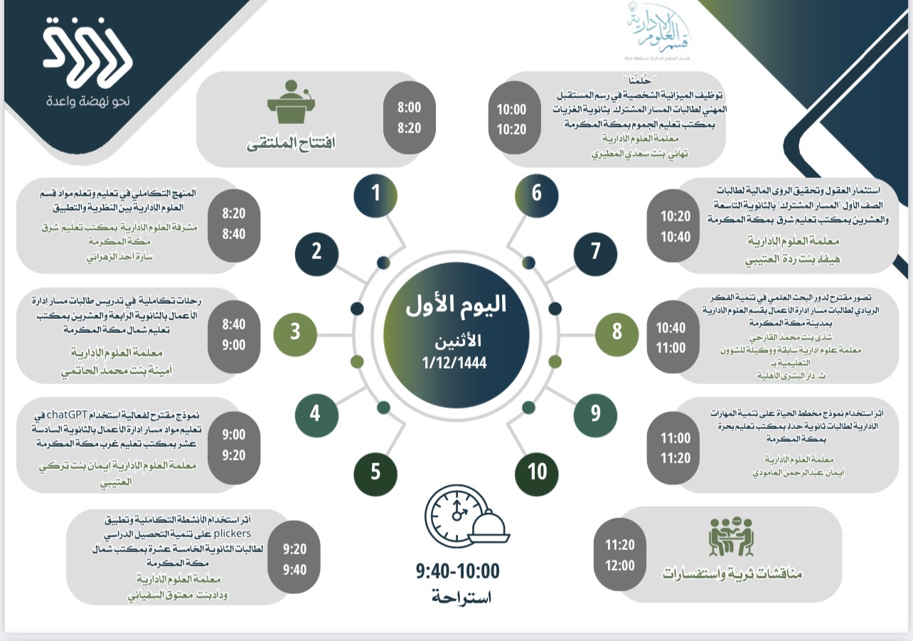 هذا وافتتحت الجلسة الأولى في الملتقى بورقة عمل بعنوان "المنهج التكاملي في تعليم وتعلم مواد قسم العلوم الإدارية بين النظرية والتطبيق" قدمتها مشرفة العلوم الإدارية بمكتب تعليم شرق مكة سارة الزهراني ، تلاها "رحلات تكاملية في تدريس طالبات مسار إدارة الأعمال في الثانوية الرابعة والعشرين بمكتب تعليم شمال مكة قدمتها معلمة العلوم الإدارية أمينة الحاتمي ، كما تم استعراض "نموذج مقترح لفعالية استخدام chat GPT في تعليم مواد مسار إدارة الأعمال في الثانوية السادسة عشر بمكتب تعليم غرب مكة والذي قدمته معلمة العلوم الإدارية إيمان العتيبي ، تلا ذلك" أثر استخدام الأنشطة التكاملية وتطبيق plickers على تنمية التحصيل الدراسي لطالبات الثانوية الخامسة عشر بمكتب تعليم شمال مكة قدمتها معلمة العلوم الإدارية وداد السفياني ، هذا وسلطت معلمة العلوم الإدارية تهاني الضوء على "حلمنا" بعنوان توظيف الميزانية الشخصية في رسم المستقبل المهني لطالبات المسار المشترك في ثانوية الغزيات بمكتب تعليم الجموم، عقب ذلك ورقة بعنوان"استثمار العقول وتحقيق الرؤى المالية لطالبات الصف الأول المسار المشترك في الثانوية التاسعة والعشرين بمكتب تعليم شرق مكة قدمتها معلمة العلوم الإدارية هيفاء العتيبي ، تلاه "تصور مقترح لدور البحث العلمي في تنمية الفكر الريادي لطالبات مسار إدارة الأعمال في قسم العلوم الإدارية بمدينة مكة المكرمة" قدمته معلمة العلوم الإدارية السابقة ووكيلة الشؤون التعليمية في ثانوية دار البشرى الأهلية شذى القارحي ، وأخيرا "أثر استخدام نموذج مخطط الحياة على تنمية المهارات الإدارية لطالبات ثانوية حداء بمكتب تعليم بحرة في مكة المكرمة قدمتها معلمة العلوم الإدارية إيمان العامودي.
