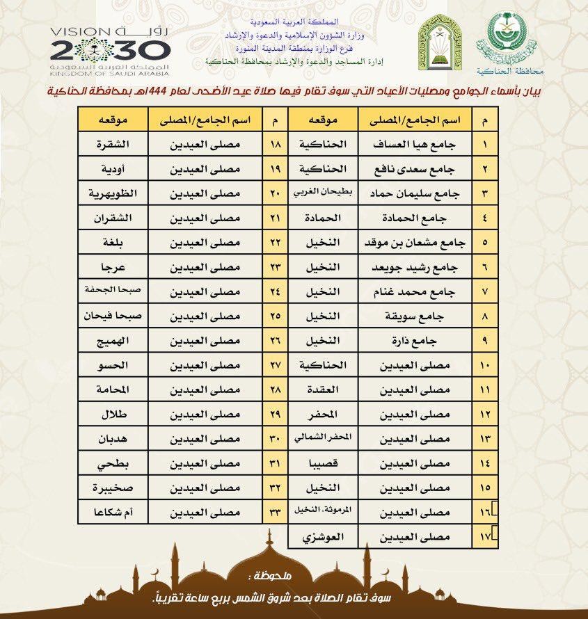 حددت محافظة الحناكية بالتعاون مع إدارة المساجد والدعوة والإرشاد بالمحافظة عن مصليات وجوامع عيد الاضحى المبارك.