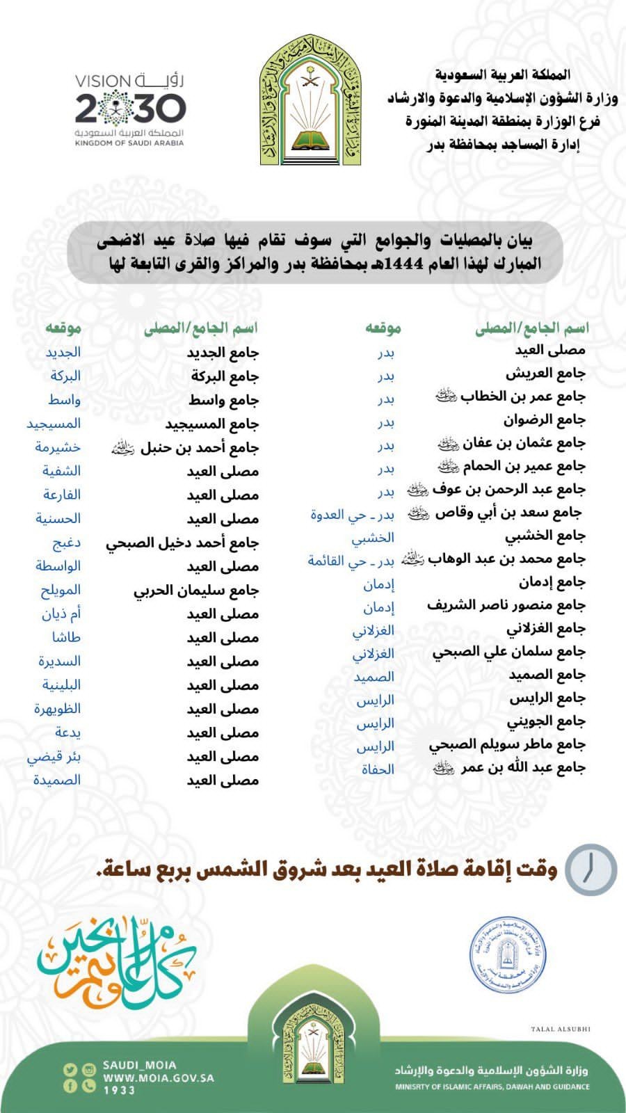 حددت محافظة بدر بالتعاون مع إدارة المساجد والدعوة والإرشاد بالمحافظة عن مصليات وجوامع عيد الأضحى المبارك.
