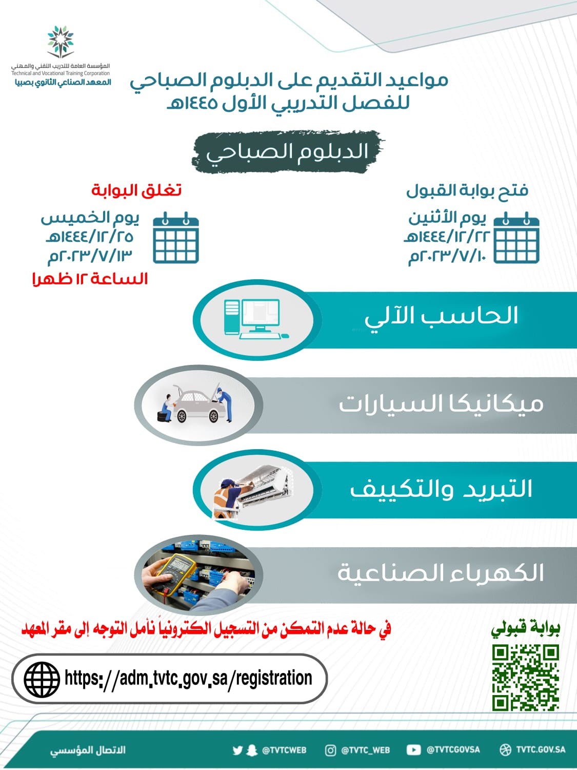 أعلن المعهد الصناعي الثانوي بمحافظة صبيا بمنطقة جازان عن فتح باب القبول الكترونيا للفصل التدريبي الأول لعام ١٤٤٣ – ١٤٤٤هـ، وذلك بدءًا من ٢٥ – ١٢ – ١٤٤٣هـ إلى ٢٩ – ١٢ – ١٤٤٣هـ