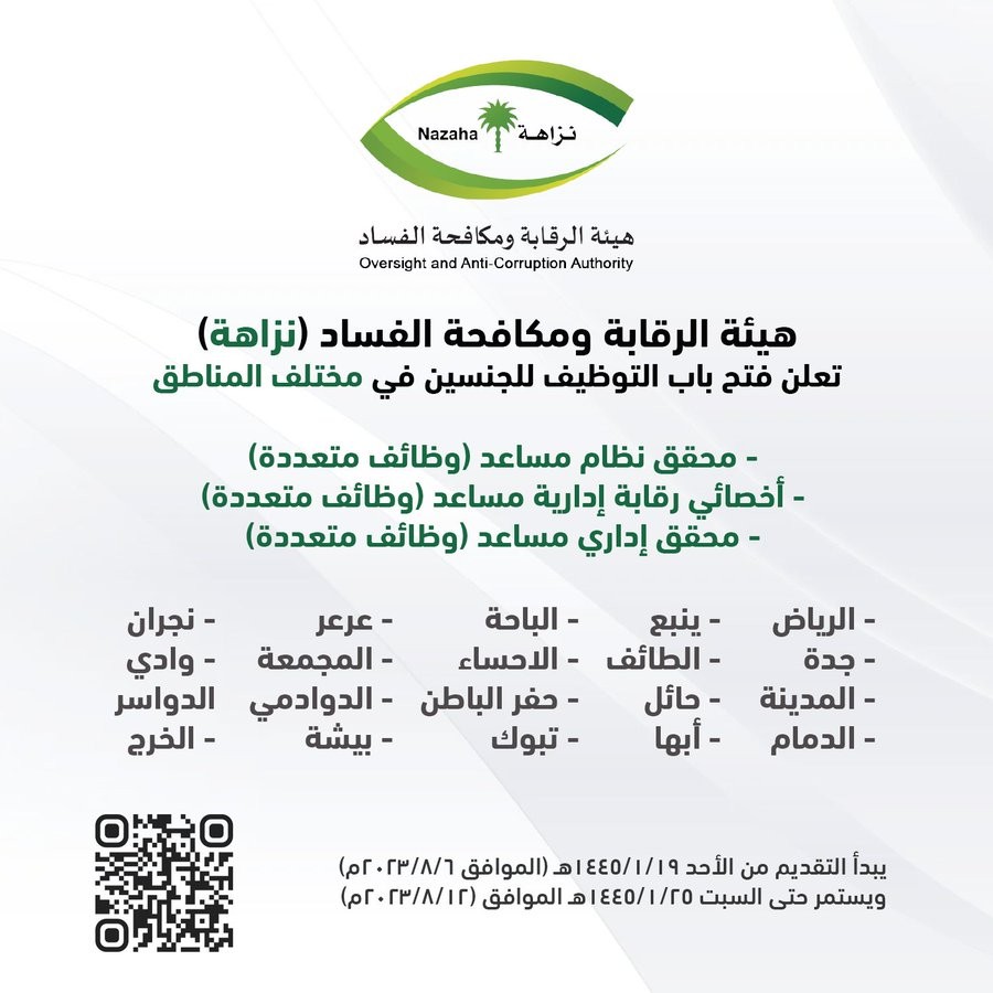 3 أيام وينتهي التقديم.. وظائف شاغرة بـ”نزاهة” في مختلف المناطق