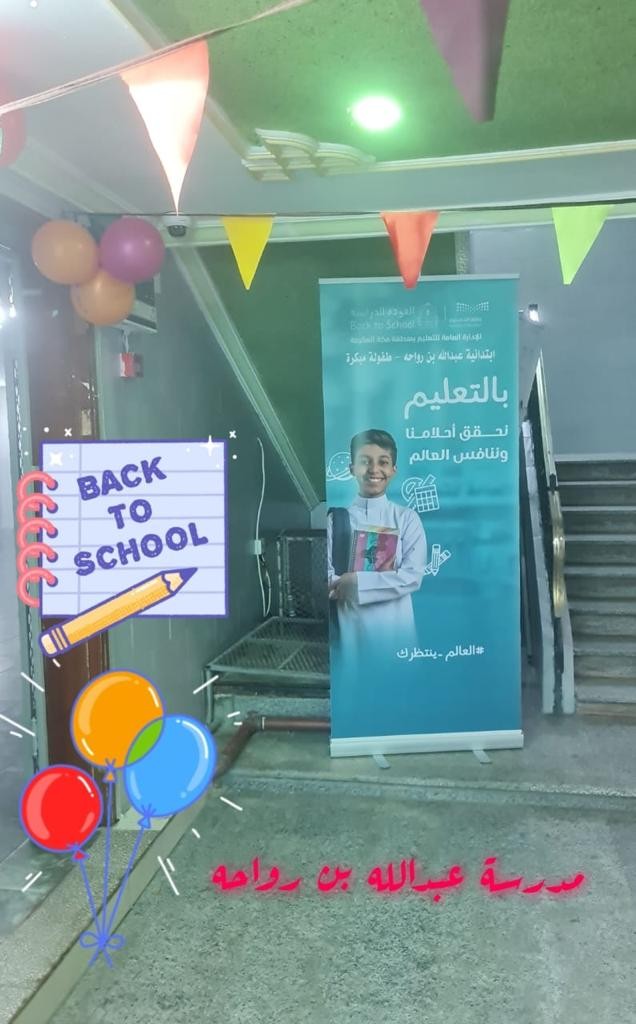 كما فعلت مدرسة عبدالله بن رواحه الابتدائية أسبوع التهيئة ببرنامج بدأ بالقرآن الكريم تلاها كلمة ترحيبية بالأمهات والطلاب ثم عرض أناشيد ترحيبية وجرت مسابقات للطلاب ثم تم توزيع هدايا تحفيزية للطلاب بعد ذلك تم الانتقال إلى مرافق المدرسة للتعريف بها أمام الطلاب بصحبة معلماتهم.