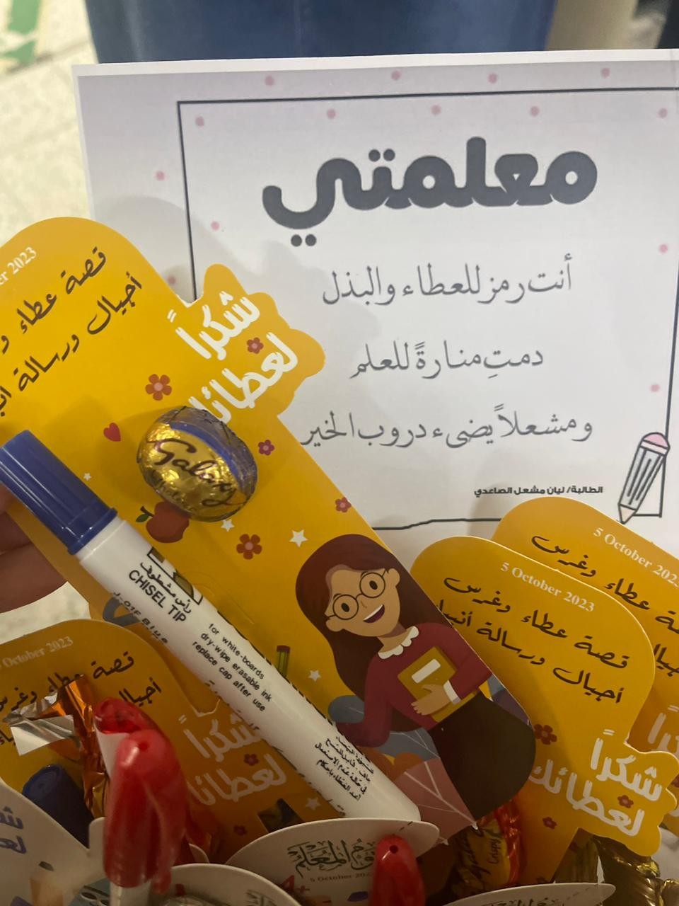 وتحت شعار "المعلمون الذين نحتاجهم للتعليم الذي نريد" فعلت الابتدائية السادسة والعشرون والمتوسطة العاشرة بقيادة مديرة المدرسة تركية الصاعدي اليوم العالمي للمعلم والذي استهل بمسيرة ترحيبية بالمعلمات ، وألقت مديرة المدرسة كلمة شكر لهن، وقدمت إداريات المدرسة والطالبات وأولياء أمورهن القصائد والأناشيد وكلمات الشكر والبطاقات والرسومات الجميلة والمسابقات والورود للمعلمات ، ثم قدمت معلمة كلمة نيابة عن زميلاتها المعلمات شكرت من خلالها الإدارة والقائمين على ترتيب الحفل، وفي الختام كرمت مديرة المدرسة تركية الصاعدي المعلمات حيث قدمت لهن الهدايا وشهادات الشكر للمعلمات ، وتم نشر فعاليات الحفل ومشاركات الجميع في وسائل التواصل الاجتماعي .