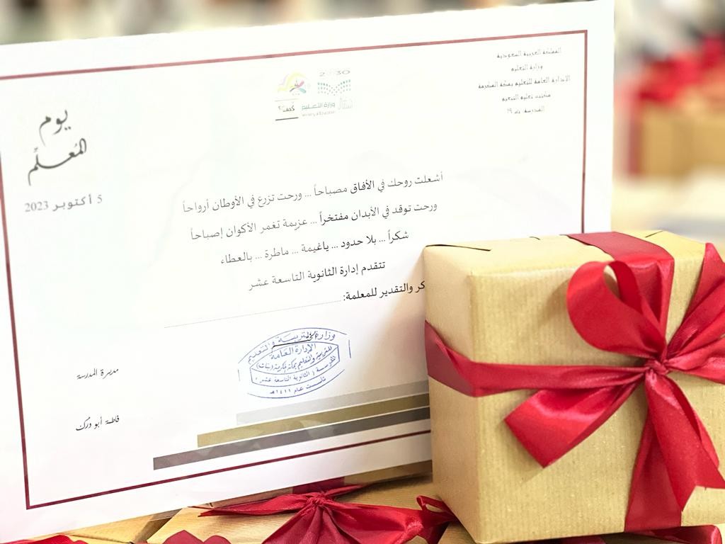 وبدورها احتفت الثانوية التاسعة عشر بيوم المعلم وذلك من خلال تقديم فقرات متنوعة نفذتها رائدة النشاط ، الموجهة الطلابية ، منسقة الإذاعة ، المنسقة الإعلامية ورائدة الشراكة المجتمعية تحت إشراف مديرة المدرسة ولجنة الاحتفاء بيوم المعلم (المعلمات المنفذات) ، والتي استهدفت استعراض دور المعلم في التعليم وإبراز جهوده من خلال المشاركة الطلابية، إقامة الفعاليات التي تبرز التقدير الكبير الذي يحظى به المعلمون والمعلمات، وبيان دور المعلم وما يبذله من جد واجتهاد في تنمية وغرس القيم والمبادي السليمة والصحيحة والوطنية في نفوس الطالبات ، والتأكيد على تعزيز مكانة في نفوس الطلاب وكذلك التأكيد على دوره في بناء الأجيال وتأصيل وتعزيز المبادرات الإيجابية تجاهه.