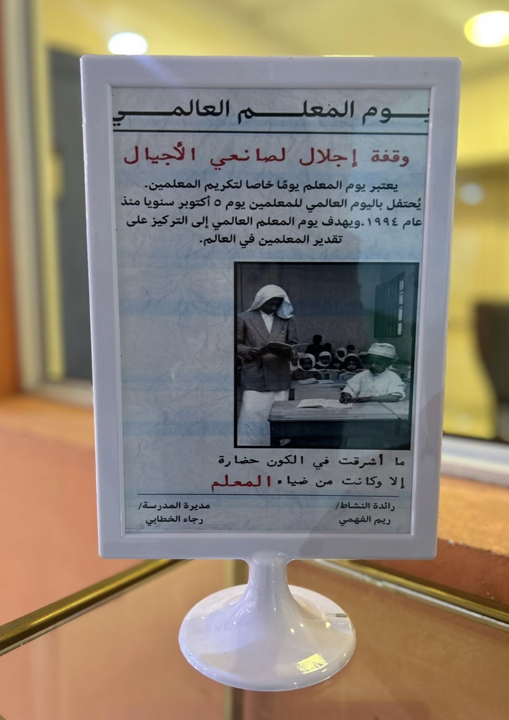 فعلت الابتدائية الخامسة بعد المائة برنامج يوم المعلم العالمي والذي نفذته مديرة المدرسة نورة اللقماني والمرشدة الطلابية إيمان سيدام.