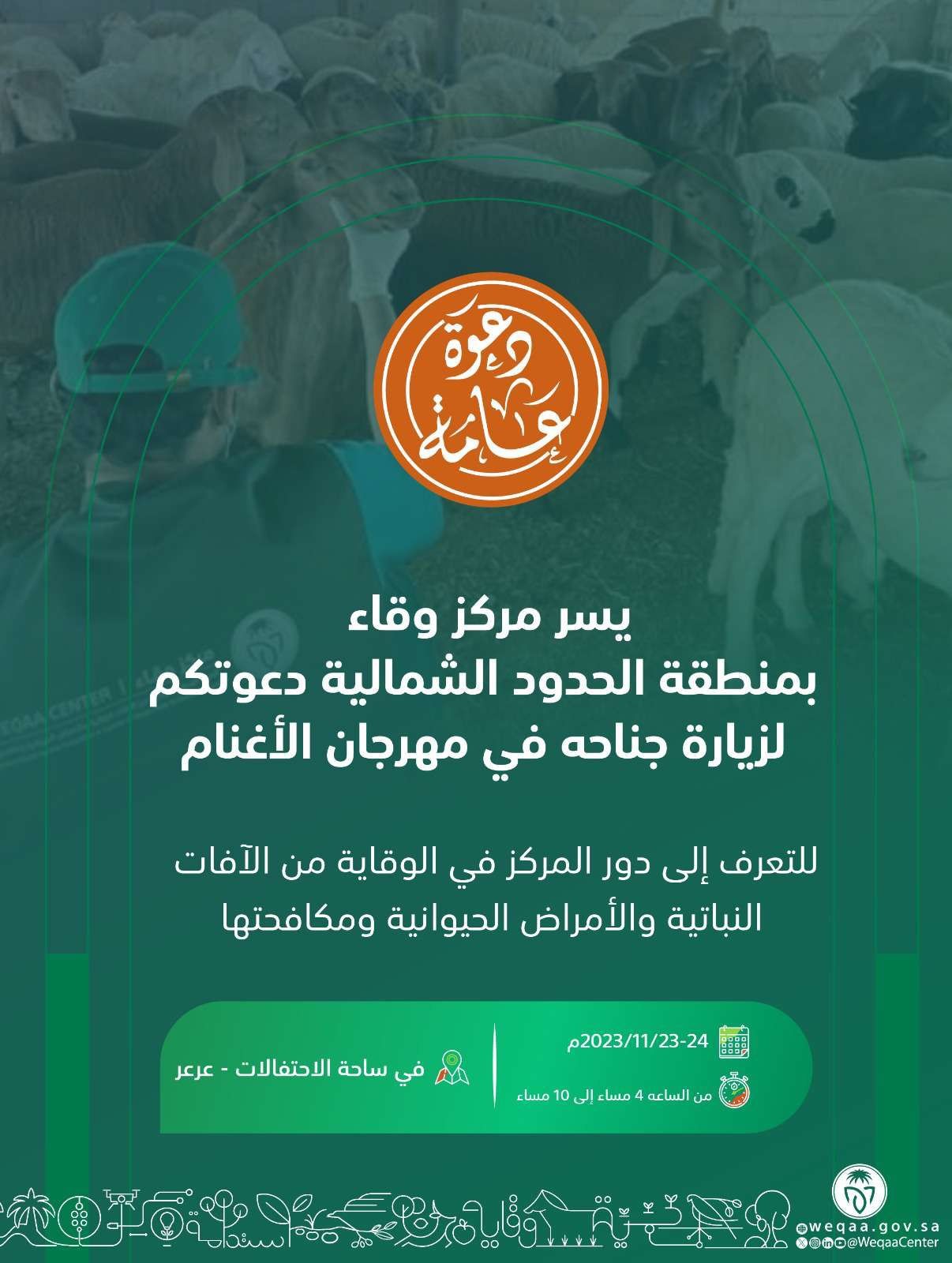 تنظم وزارة البيئة والمياه والزراعة ، يوم الخميس القادم، مهرجان أصول الأغنام المحلية، "فحول وإنتاج وتسمين" ، بمنطقة الحدود الشمالية، وذلك في ساحة الاحتفالات بمدينة عرعر، ولمدة يومين.