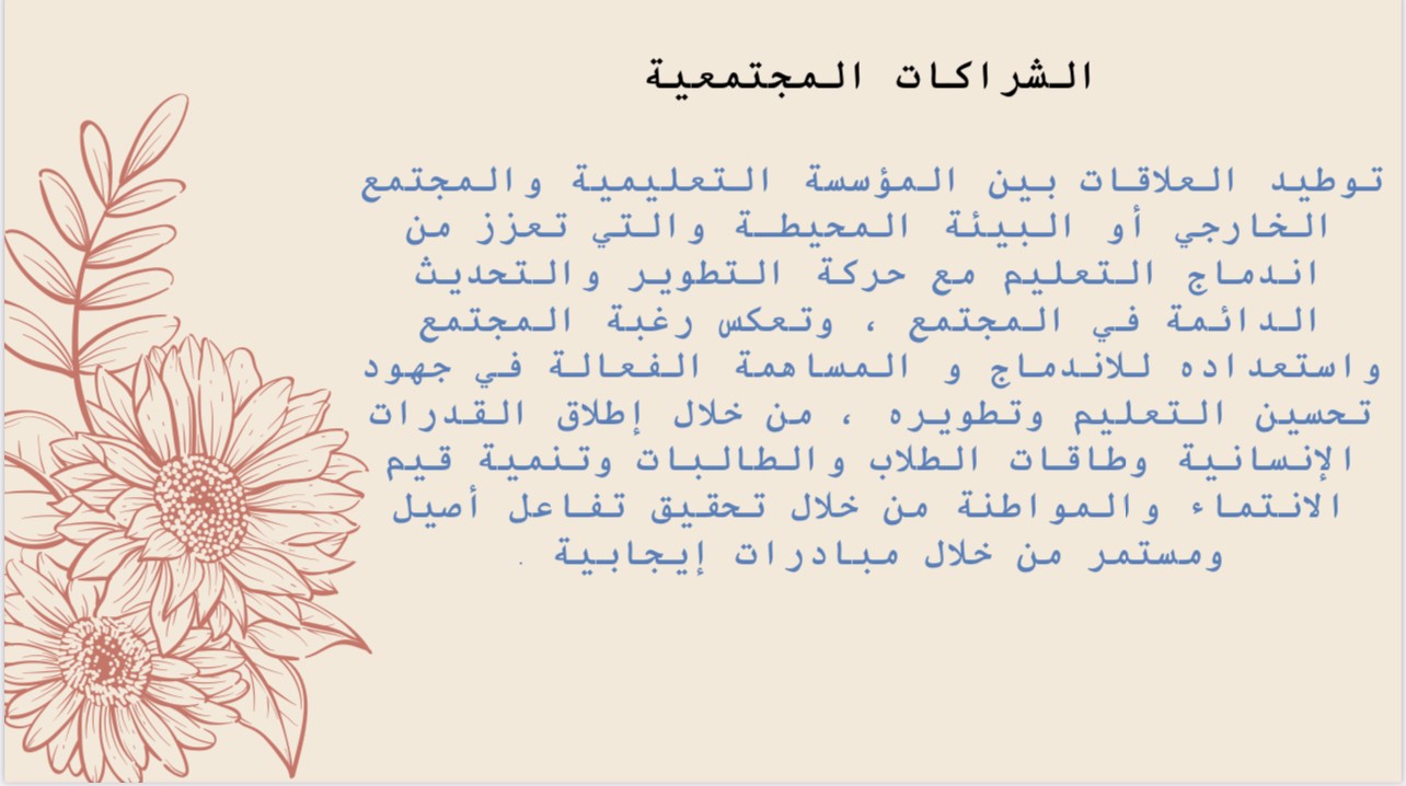 فيما استهدفت اللقاءات الأسرة (أولياء الأمور) ومؤسسات المجتمع المحلي وذلك بهدف تبادل الآراء ونقل المعارف والتجارب والخبرات بين الإدارات والوقوف على أفضل الممارسات في تطبيق الشراكة ، الاستفادة من الخطط التربوية والتجارب الناجحة في مجال الشراكة، توثيق العلاقة التعاونية والتكاملية بين المدرسة والأسرة لدعم تعلم الأبناء، عرض سبل معالجة التحديات والصعوبات التي تواجه المدرسة مع أولياء الأمور، الإسهام في تحسين عملية تعليم الطالبات وتعلمهم، واستقطاب مؤسسات المجتمع لدعم تعلم الأبناء وتقديم الدعم المناسب لهم.