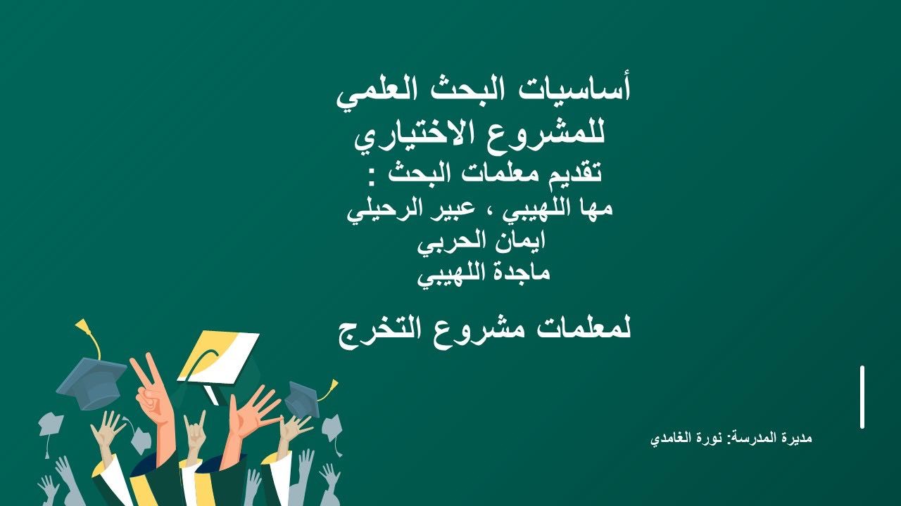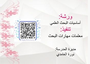 الورشة من إعداد وتقديم معلمات البحث ومصادر المعلومات. :إيمان الحربي ، ماجدة اللهيبي ، مها اللهيبي ،ومعلمة الاجتماعيات: عبير الرحيلي بحضور مديرة المدرسة نورة الغامدي ومعلمات مشروع التخرج ولجنة نظام المسارات المشرفة لأبحاث ومشاريع التخرج.
