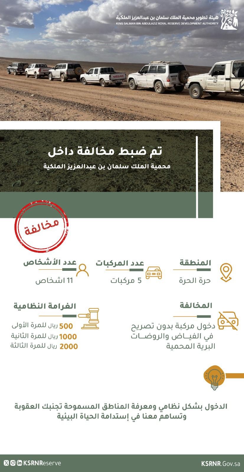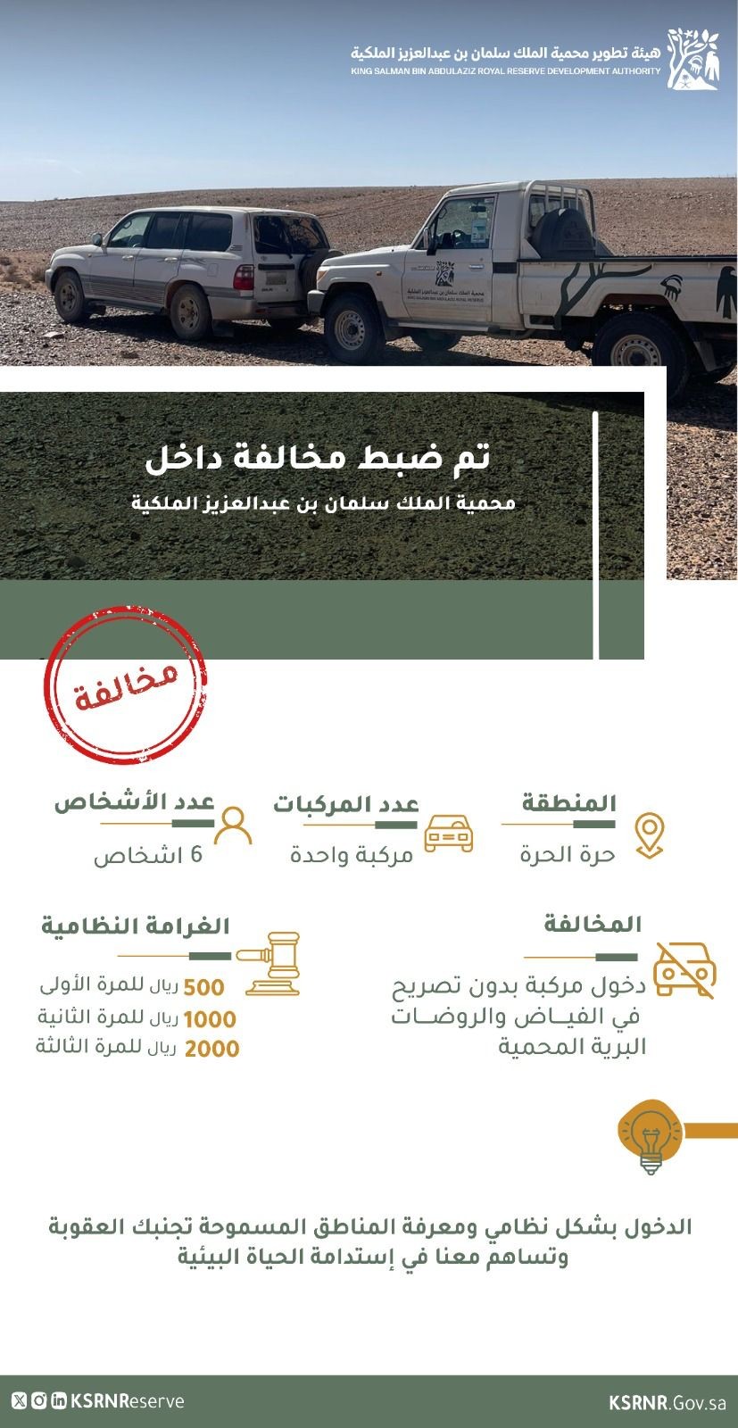 *محمية الملك سلمان بن عبدالعزيز الملكية تضبطُ 9 مركبات و 25 شخص مخالف في محمية حرة الحرة*