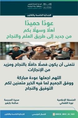 نفذها منسوبات المدرسة بقيادة مديرة المدرسة صالحة بازهير حيث تم توفير التجهيزات التعليمية التي تتضمن بيئة تعليمية تربوية مثالية للطالبات وتهيئتهن بمختلف المراحل الدراسية لاستقبال العام الدراسي الجديد نفسيا وذهنيا وسلوكيا مع التركيز على تعزيز السلوك الإيجابي.